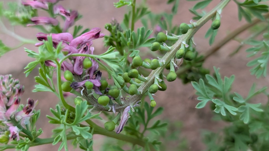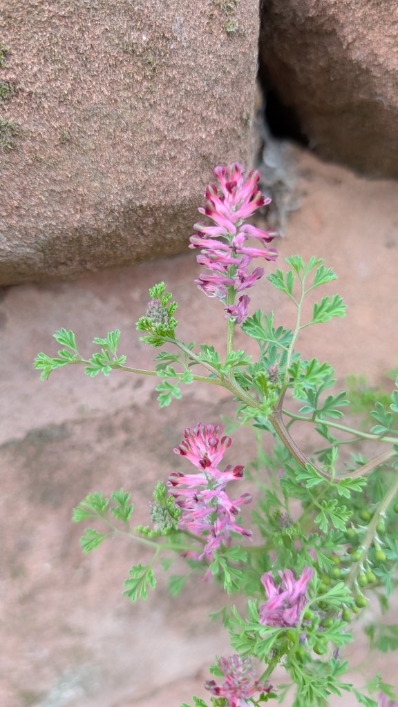 - Common fumitory Fumaria officinalis subsp. officinalis. This was growing directly out of a recently rebuilt sandstone wall on Lincomb Lane. With small flowers, fruits wider than long and sepals around 1.5mm, I decided this was F. officinalis. As it had around 37 flowers to a raceme, I believe it’s subspecies officinalis – which usually has 20-40 flowers.