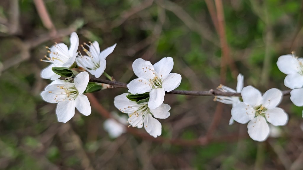 - Blackthorn Prunus spinosa now flowering and replacing P. cerasifera in hedgerows. Notice the dull brown twigs, spines and non-reflexed sepals.
