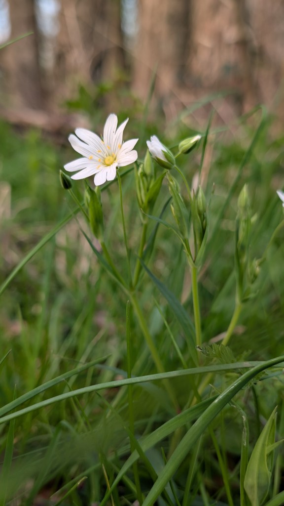 - Greater stitchwort Stellaria holostea along the woodland edge leading to Lincomb Lock along the River Severn.