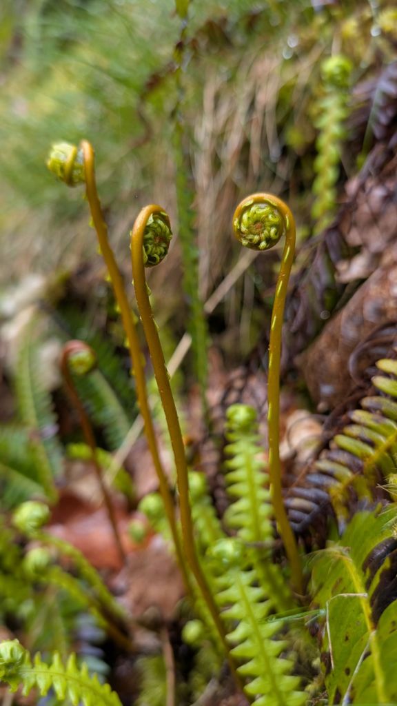 I suppose the most conspicuous thing is still the bluebells, but the wild garlic and hawthorn isn’t far behind now. Ferns are beginning to unfurl, and spikes of bugle are flowering along woodland rides and in our back garden.