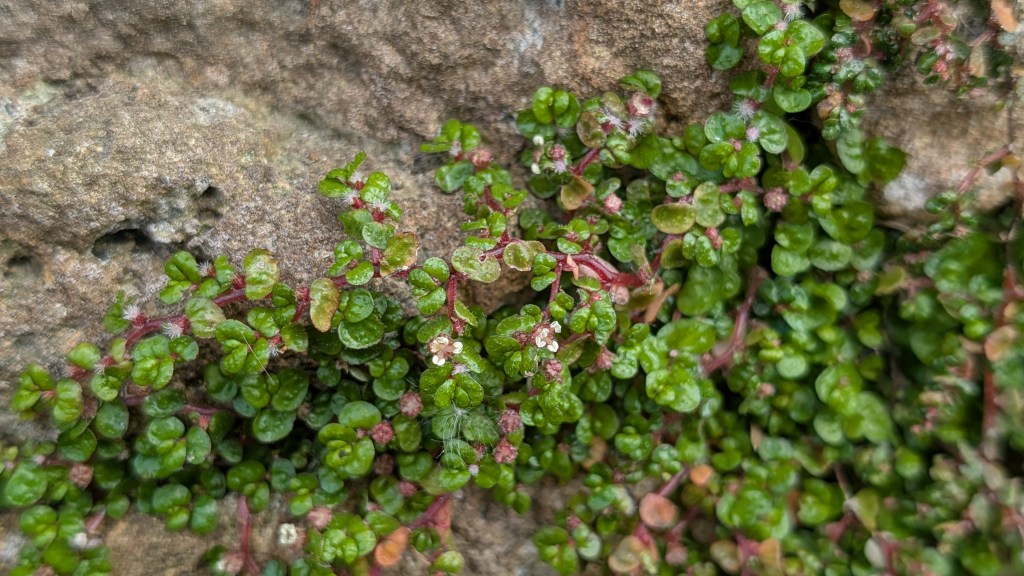 - What was the small, white-flowered plant in Broadway? Mind-your-own-business Soleirolia solerolii “An evergreen, procumbent, carpet-forming perennial herb, frequently escaping from gardens and greenhouses and found in lawns and on pavements, steps, damp paths, shaded banks, streamsides, sandstone outcrops, by drains, gutters, ditches, roadside walls, and in sheltered places in churchyards and cemeteries.”- BSBI Atlas
