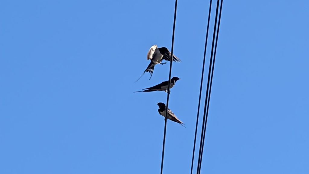 The swallows are still here, and as I trundled east, I passed beneath three birds squabbling for a spot on overhead lines.
